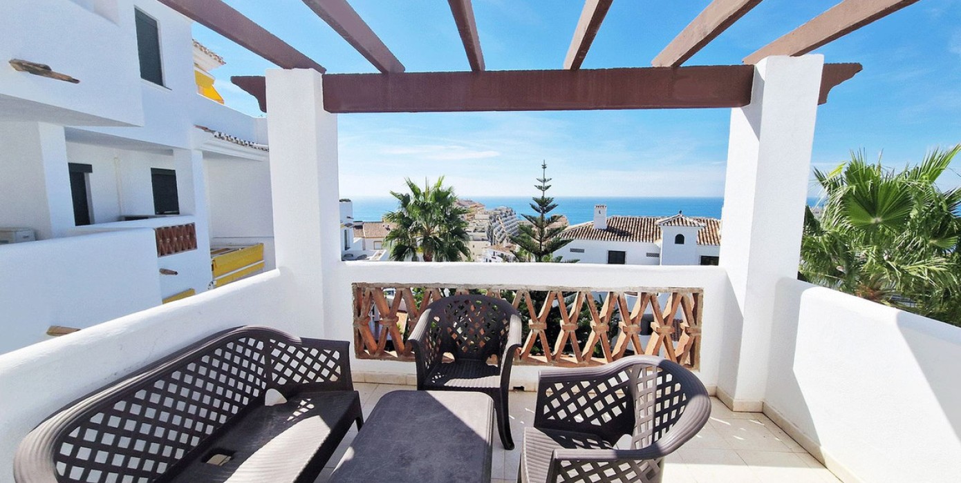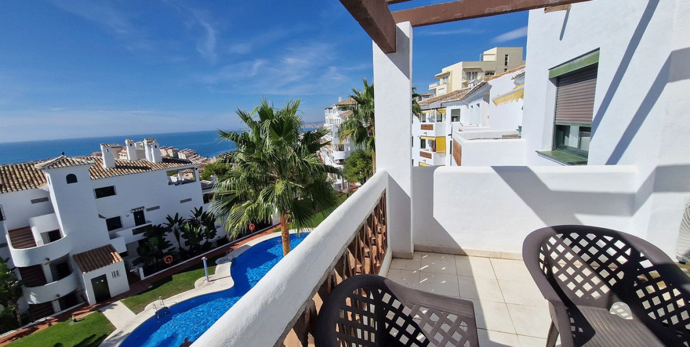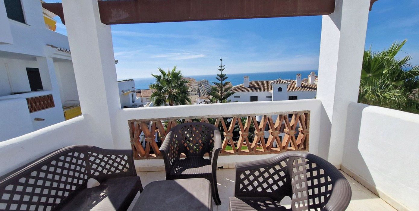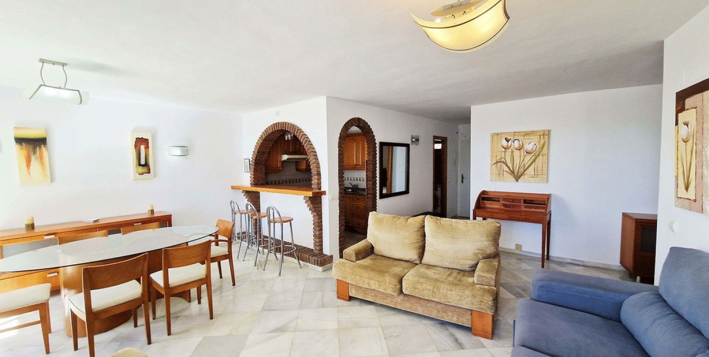 RARE ON THE BENALMADENA PROPERTY MARKET! Spacious apartment with panoramic sea views for sale in a beautiful, well-maintained Andalusian-style urbanisation just 10 minutes' walk from the seafront and the Benalmadena Costa beaches. This 118m2 property is located on the third floor (the fourth and top floor has only one penthouse) of this attractive and charming urbanisation. It comprises 3 bedrooms, 2 bathrooms, one of which is en suite, a semi-open fitted kitchen adjoining the large living/dining room which opens onto the 10m2 terrace, which is bathed in sunlight all day long and has uninterrupted views over the swimming pool, the sea and the coast of Benalmadena as well as the bay of Fuengirola.