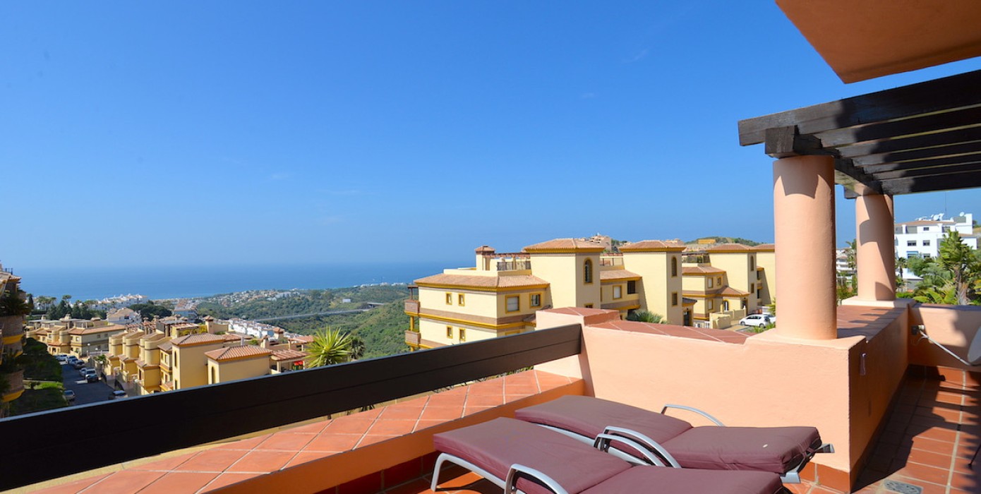 This very bright apartment is located in Calahonda in a gated private complex with communal swimming pools and grassy sunbathing areas. You are close, a short downhill walk to a well known delicious pizza restaurant. A few minutes drive takes you into the heart of Calahonda with many lively bars, cafes, restaurants, shops, supermarkets, banks, pharmacies and other amenities. Calahonda also has a golf course, tennis club and many children parks and play areas. This 2 bedroom 2 bathroom apartment is 89m2 build and enjoys a terrace of 28m2 with unobstructed panoramic sea views. The entrance area leads into the light-filled living and dining area, which continues through large sliding windows to the terrace from which you have a wonderful views of the Mediterranean coast and out to the African coast.