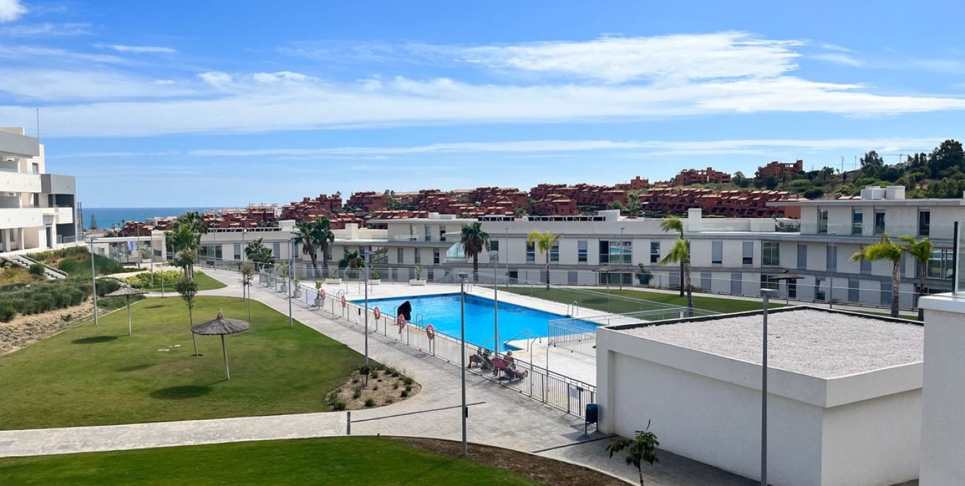Fantastic first floor apartment finished in 2021, the complex is fully gated and secure. The beach is a 10 mins walk or 2 mins drive in the car. Close to Estepona centre, Duquesa Marina and all amenities,. The apartment is open plan with a fully fitted kitchen, lounge/diner and double patio doors leading to the south facing terrace. This terrace is overlooking the swimming pool and has lovely sea views. There are two double bedrooms and two bathrooms. The master bedroom is ensuite and has double patio doors leading to a private terrace with mountain views. The second double bedroom has double patio doors leading to the main terrace and offers sea and pool views.