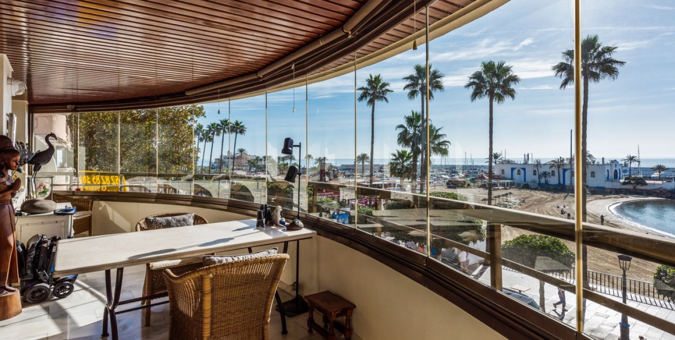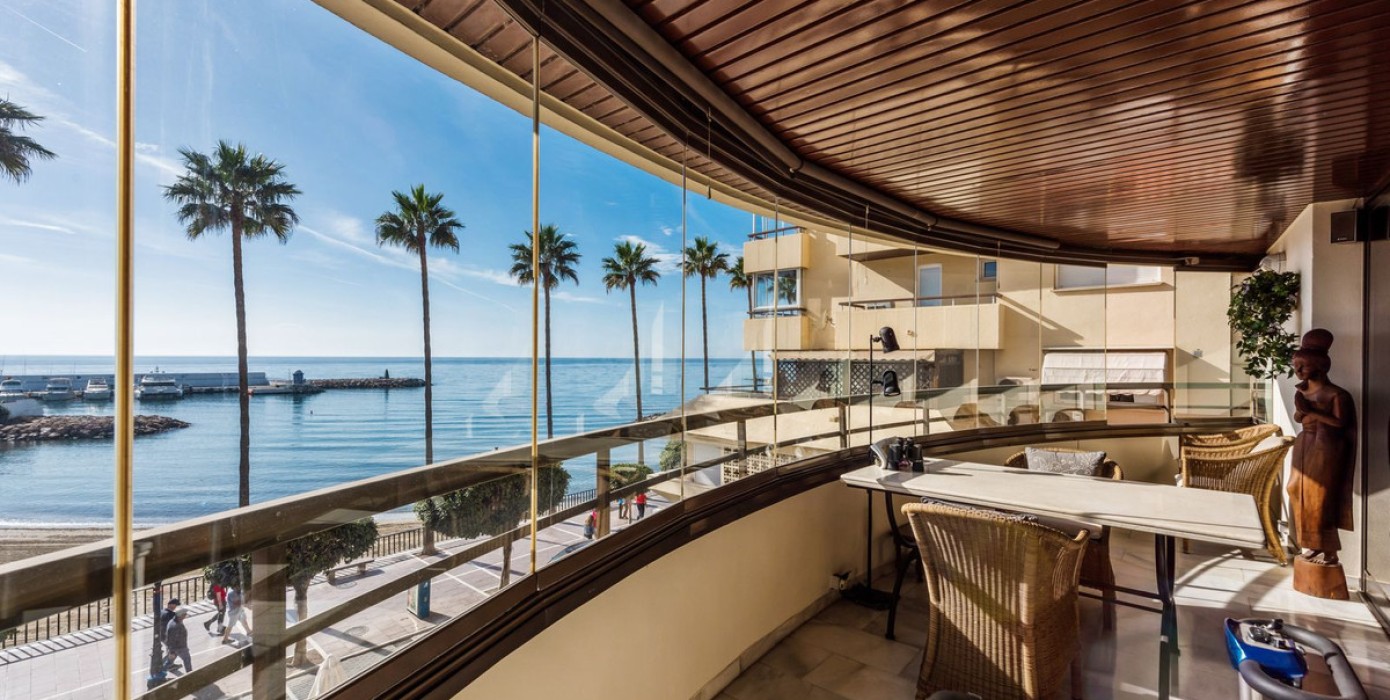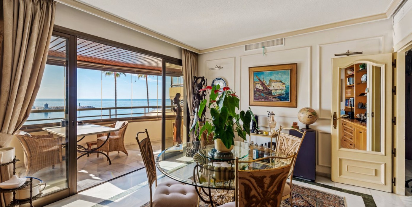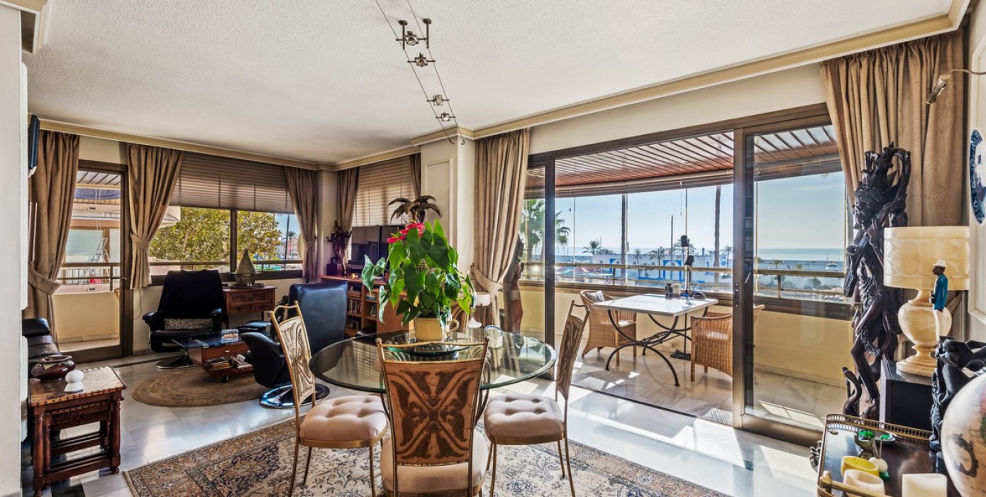 Situated on the Marbella beachfront with direct access to its lovely boardwalk, this iconic building offers stunning views to the sea & marina.The property has lift access and an underground parking space and store room are also included.This apartment comprises of the entire second floor of the building with front, side and back terraces.The living room has access to the South-facing terrace which has the frontal sea view and has been equipped with window curtains.