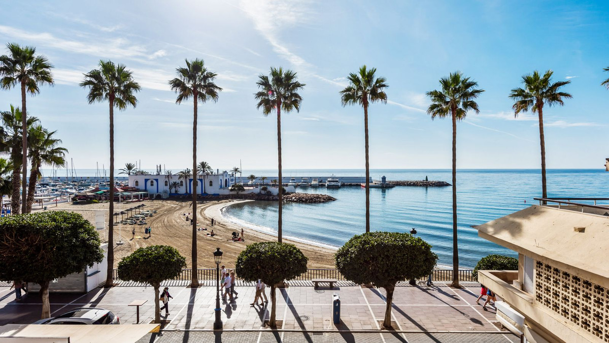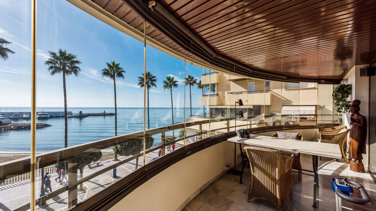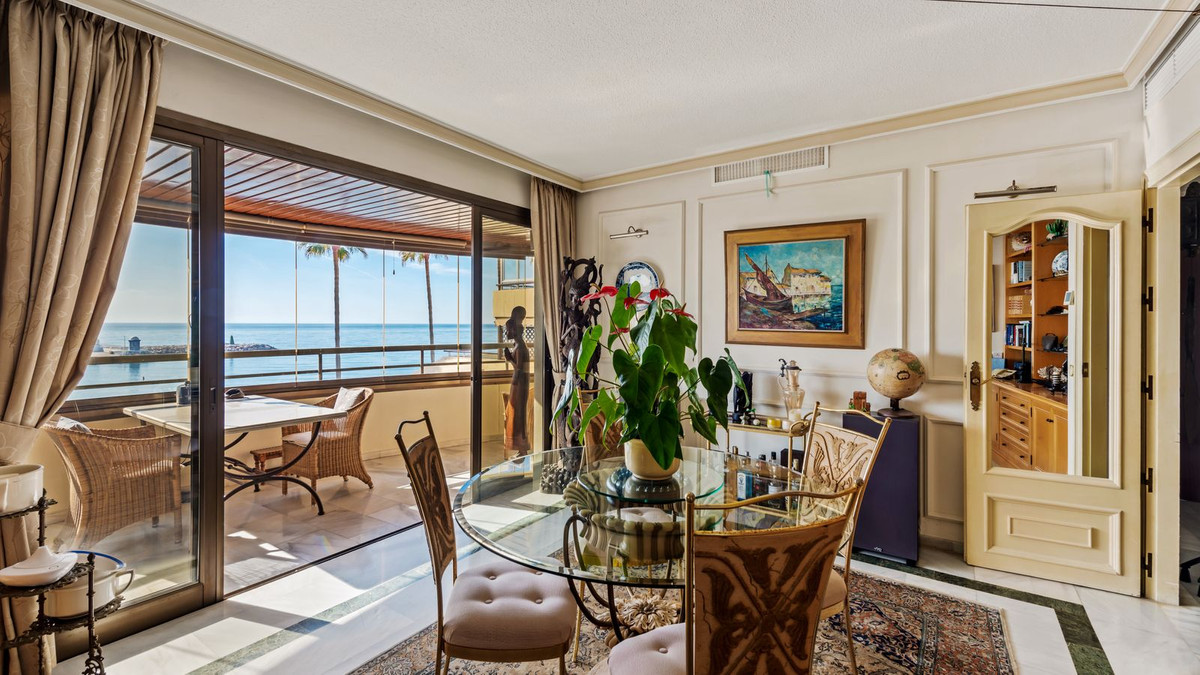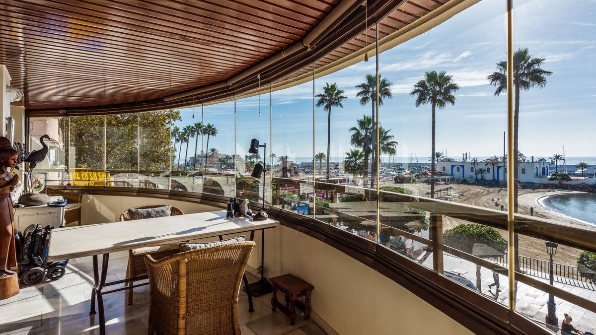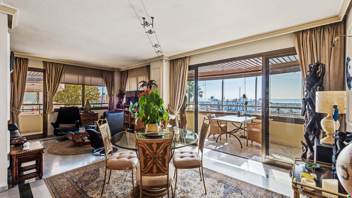 Situated on the Marbella beachfront with direct access to its lovely boardwalk, this iconic building offers stunning views to the sea & marina.The property has lift access and an underground parking space and store room are also included.This apartment comprises of the entire second floor of the building with front, side and back terraces.The living room has access to the South-facing terrace which has the frontal sea view and has been equipped with window curtains.