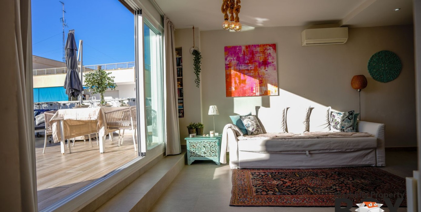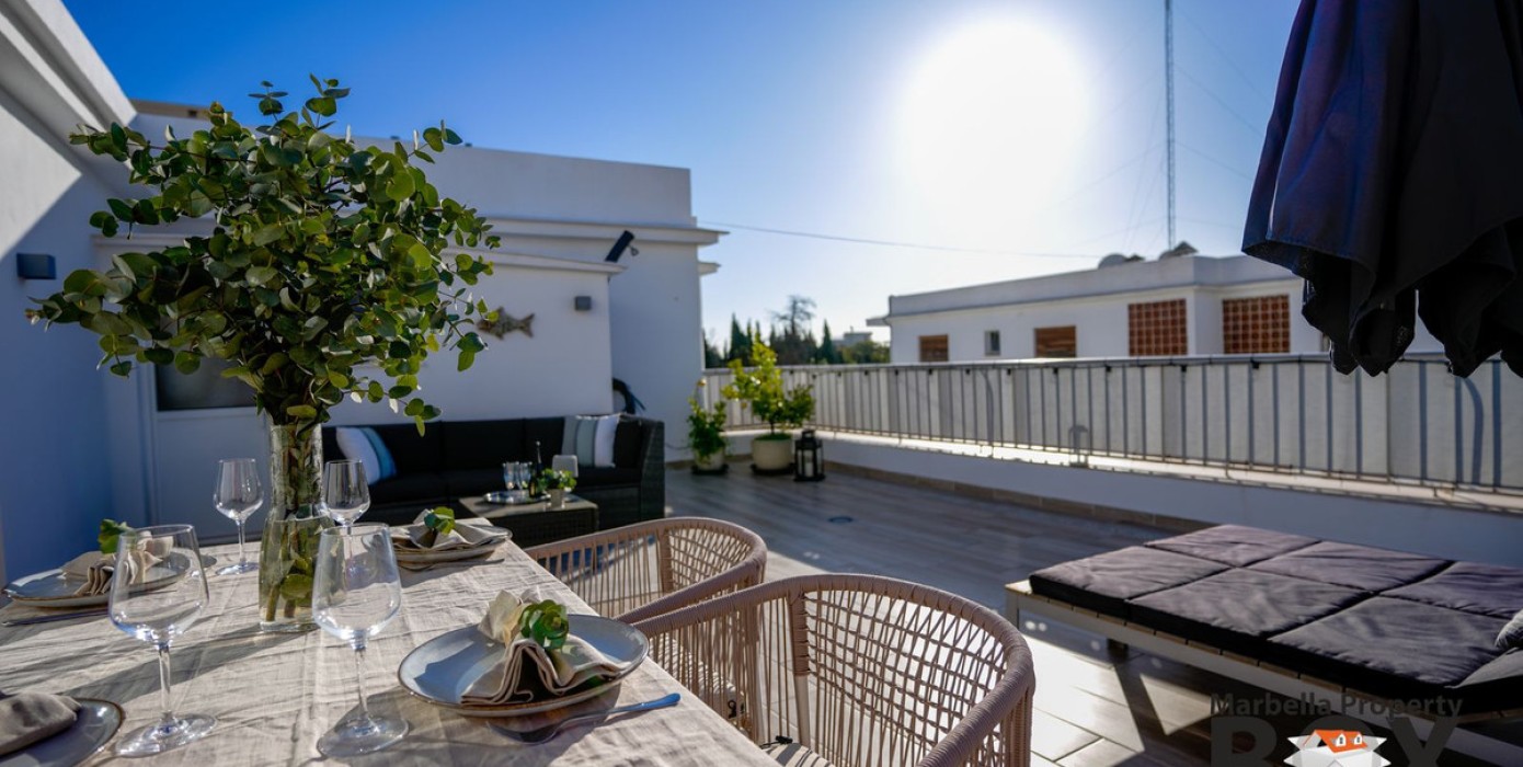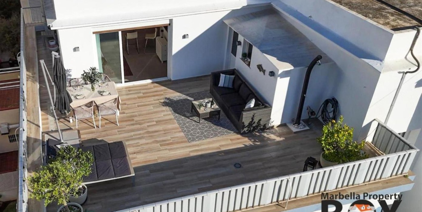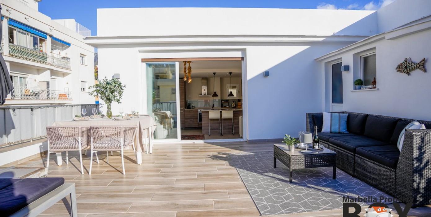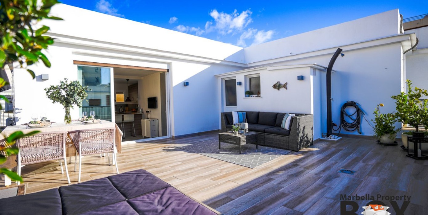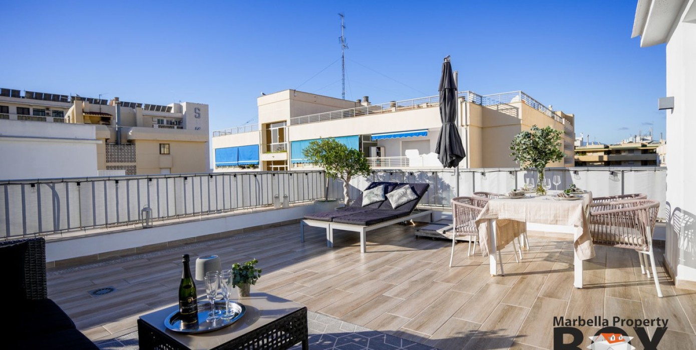 A truly and unique gem in Marbella. Beachside penthouse, located in the lively centre of Marbella and just a pleasant minutes' walk from the beach. This beautiful and cosy 1-bedroom penthouse apartment comes with a magnificent private terrace facing southwest. From the terrace you can enjoy the sun throughout the day, from the first rays of the morning sun until the sunset. The property is in an excellent state having been completely renovated. The living room and the kitchen are perfectly integrated, with easy access to the outside terrace. The cosy bedroom has an en-suite bathroom with shower. Upon entering the apartment through the new handcrafted security door in pinewood you come straight into the hallway with lots of wardrobe space. As you proceed you are then welcomed by a stunning kitchen island that is harmoniously integrated with the living area and the terrace, giving the impression that it is part of the living room.