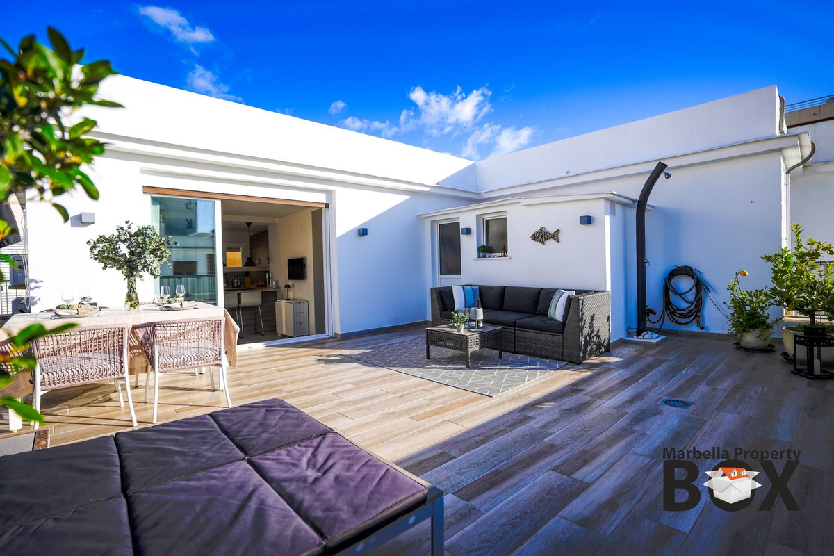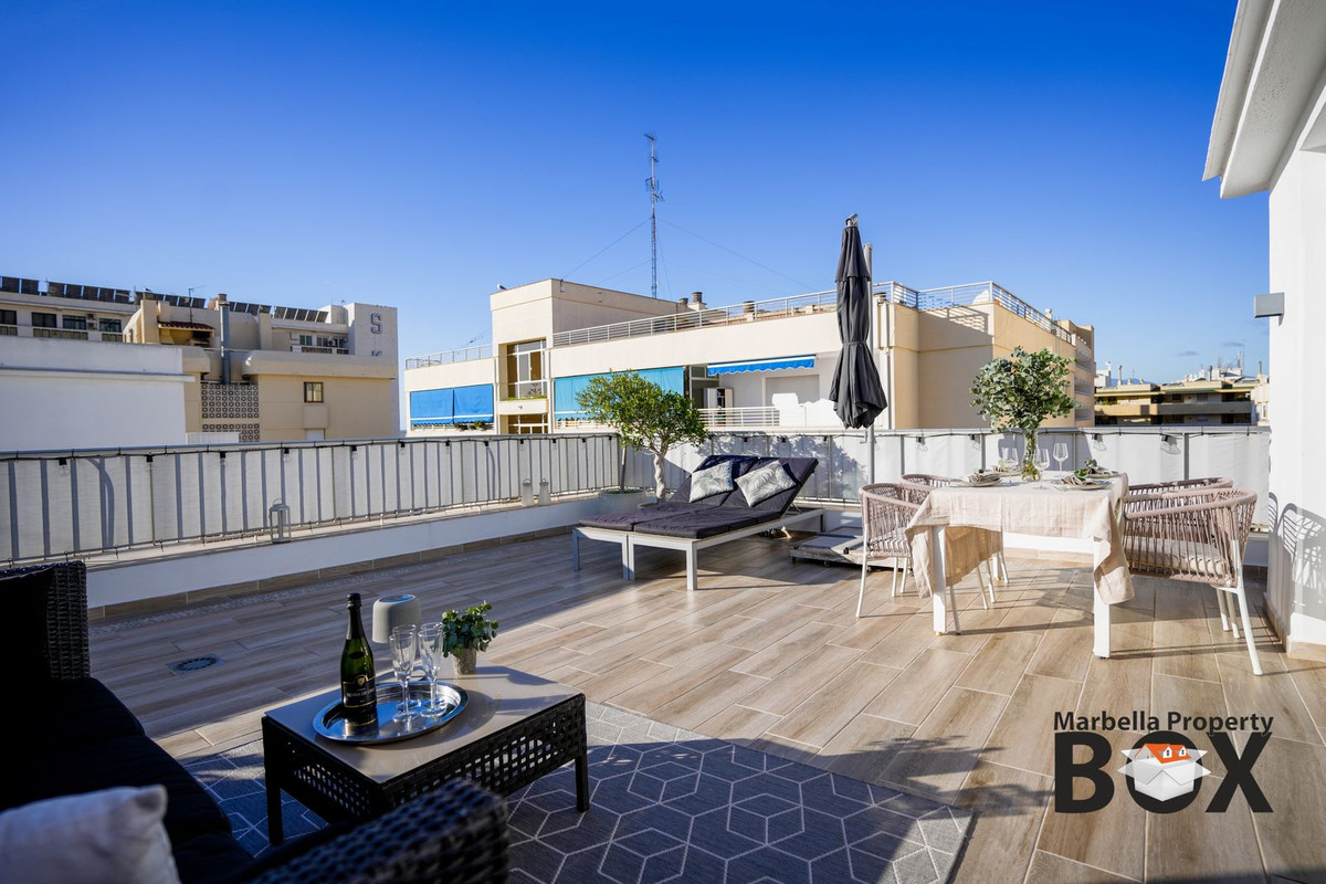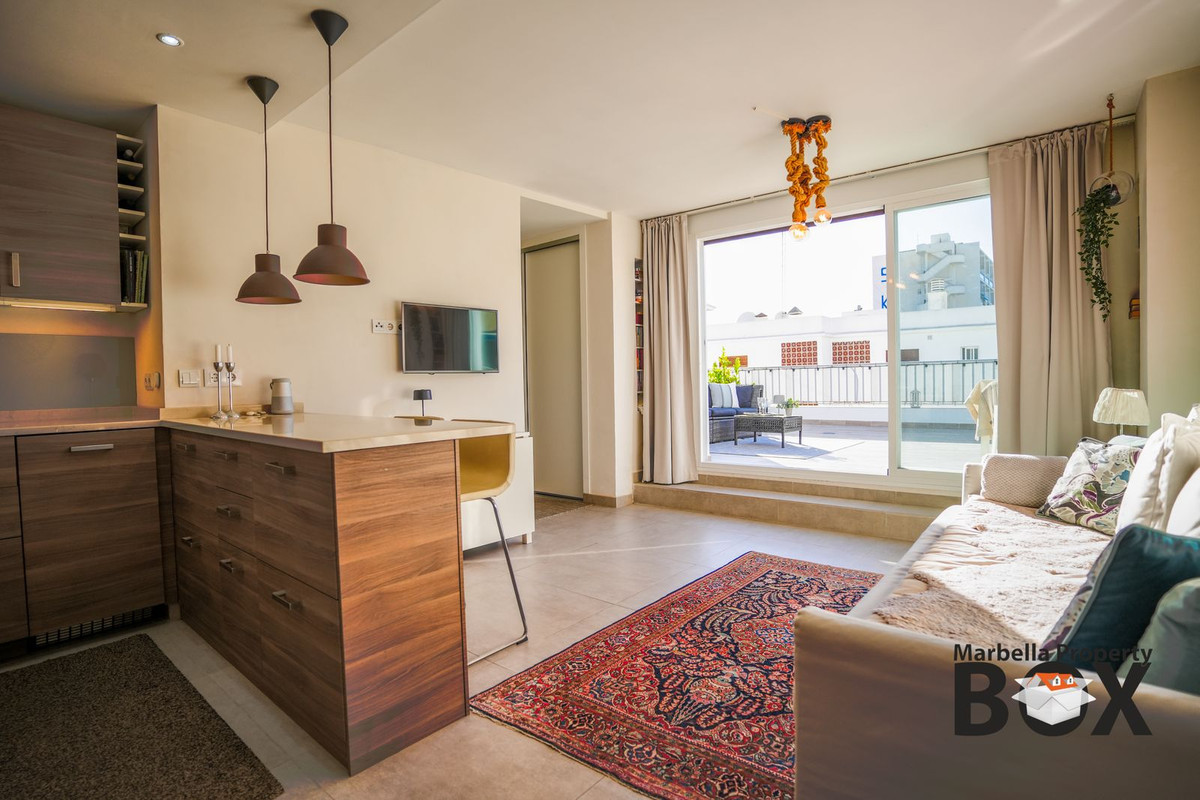 A truly and unique gem in Marbella. Beachside penthouse, located in the lively centre of Marbella and just a pleasant minutes' walk from the beach. This beautiful and cosy 1-bedroom penthouse apartment comes with a magnificent private terrace facing southwest. From the terrace you can enjoy the sun throughout the day, from the first rays of the morning sun until the sunset. The property is in an excellent state having been completely renovated. The living room and the kitchen are perfectly integrated, with easy access to the outside terrace. The cosy bedroom has an en-suite bathroom with shower. Upon entering the apartment through the new handcrafted security door in pinewood you come straight into the hallway with lots of wardrobe space. As you proceed you are then welcomed by a stunning kitchen island that is harmoniously integrated with the living area and the terrace, giving the impression that it is part of the living room.