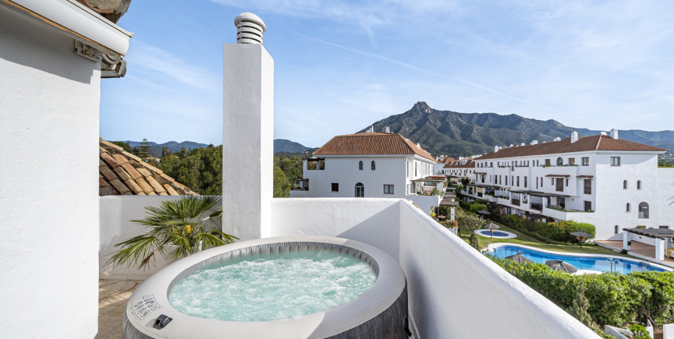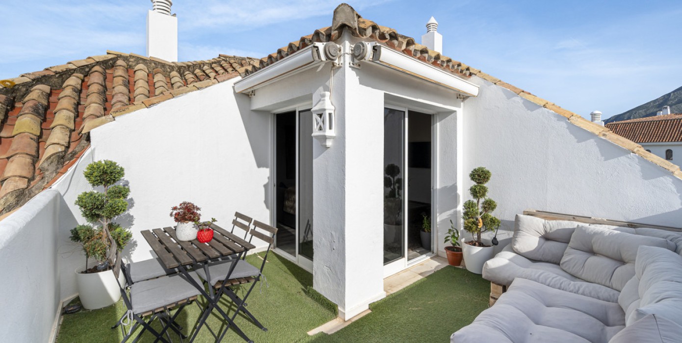 This penthouse apartment is located in Las Lomas del Marbella Club in a prestigious urbanization with well kept communal gardens, 3 swimming pools, one of them heated in spring and 24 hour concierge/security service. The apartment consists of an entrance hall, from which stairs lead to the first floor which comprises of a comfortable living room with dining area, a fully fitted kitchen, two bedrooms and two en suite bathrooms all refurbished to the highest standards and in very good taste.