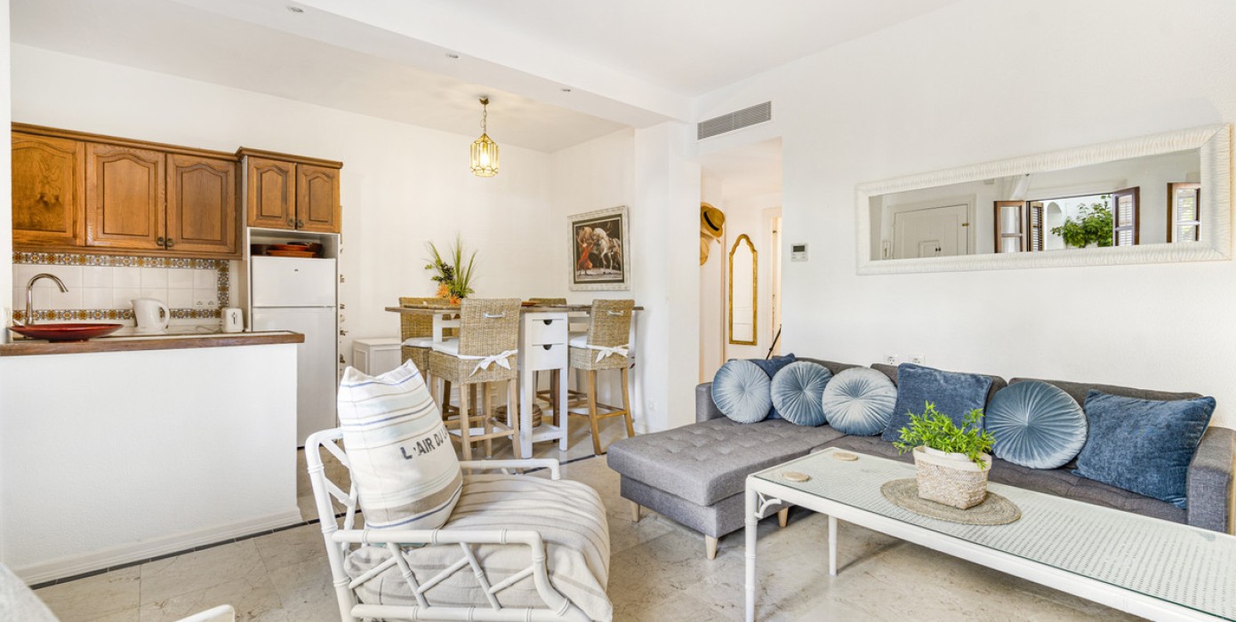 Close to all local amenities, Puente Romano and the beach. The property has an open plan living and dining area; fully equipped open plan kitchen; two bedrooms with beautiful views over the community; and a shared bathroom. Other features include hot and cold air conditioning and fitted wardrobes