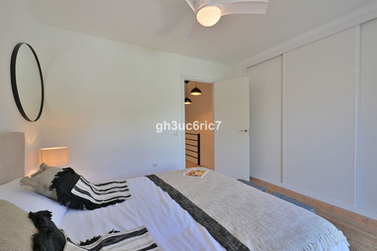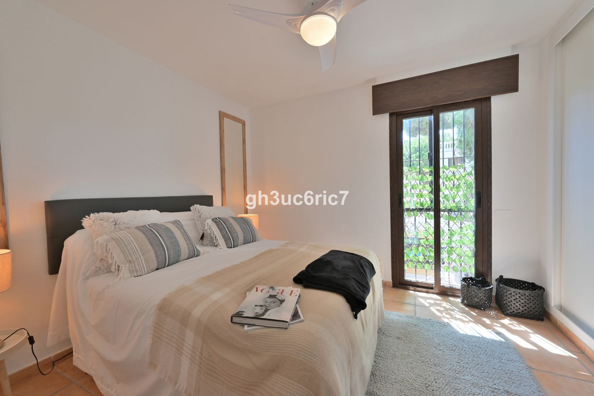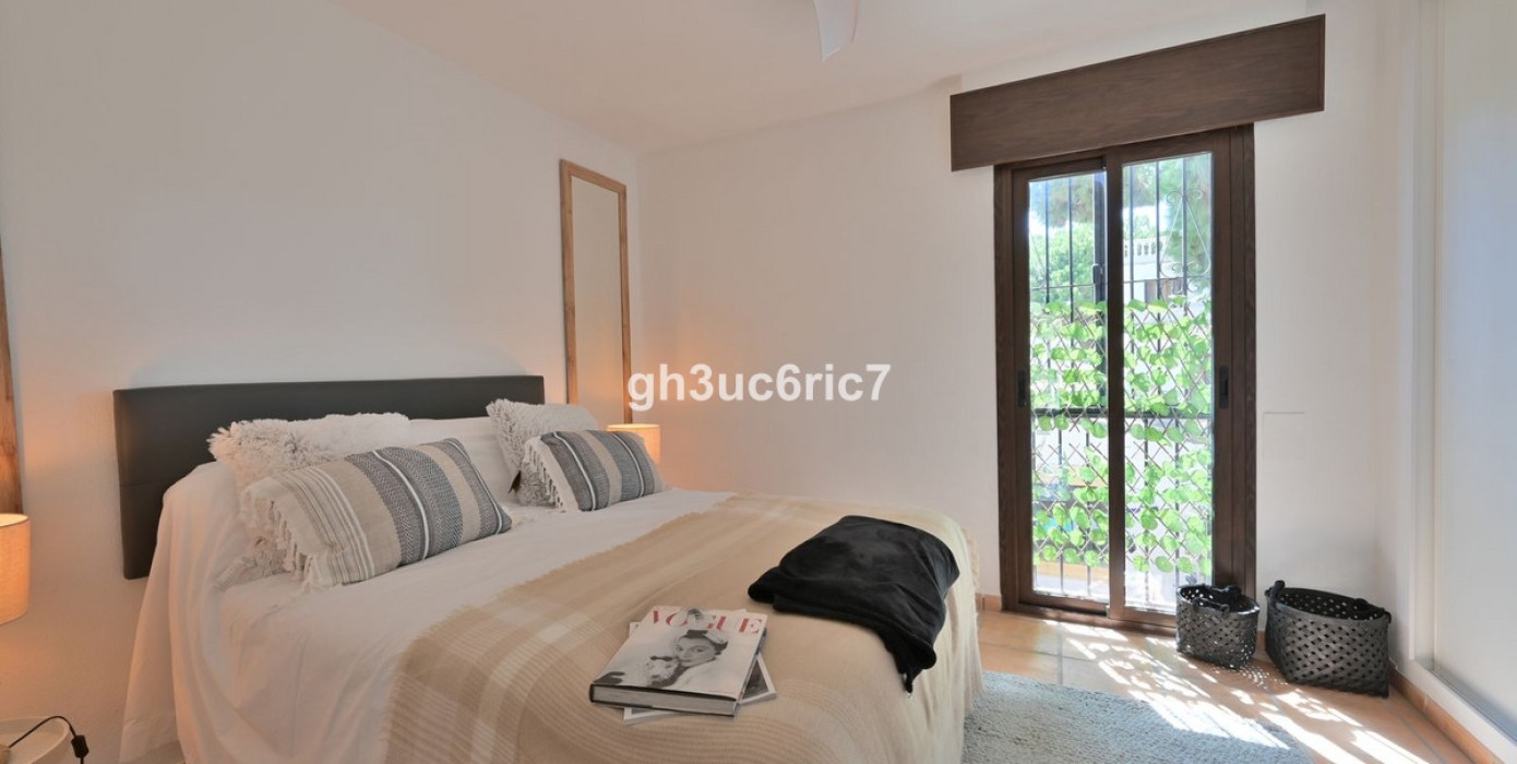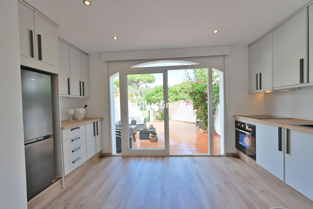 This stunning 3 bed / 1.5 bathroom townhouse is located in a charming area of Elviria, a few minutes walking distance to an abundance of bars, shops and restaurants as well as the white beaches by Golden Beach. The property has been carefully reformed by its current owner and is being sold fully furnished, as seen. The private garden leads out to a mature, green area where you will find a large swimming pool (with lifeguard) and paddle courts.On the entrance level there is a bedroom and a cloak room, as well as a spacious open-plan living area with kitchen containing all new appliances.