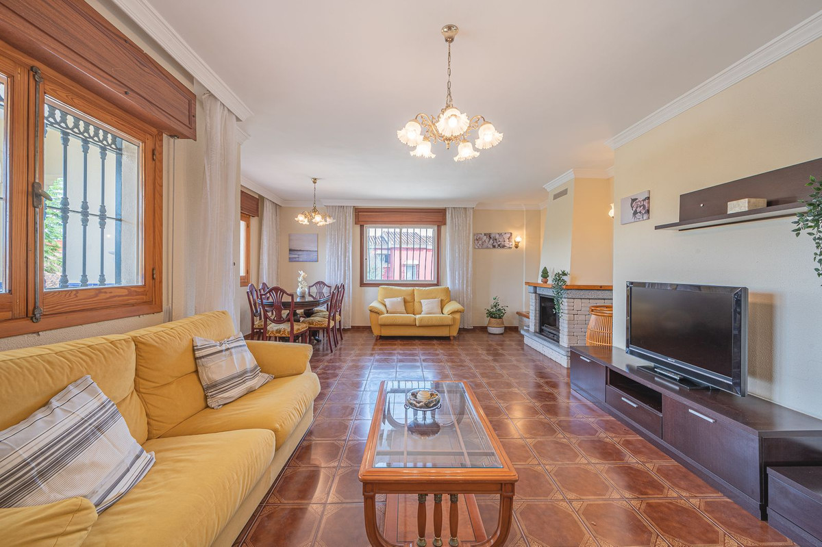Large villa in Cortijo del Sol in Alhaurin de la Torre. It consists of two floors, on the first floor we find a large living room of about thirty meters with a fireplace, three bedrooms, two of them double and one single, all with fitted wardrobes. Two full bathrooms one with a bathtub and the other with a shower, one of them en suite. Independent kitchen equipped with access to one of the terraces. On the ground floor there is a type loft of 120 m2, from which rooms can be taken, currently it has a furnished and equipped kitchen, a complete bathroom and a large living room, the ground floor communicates with the garage.