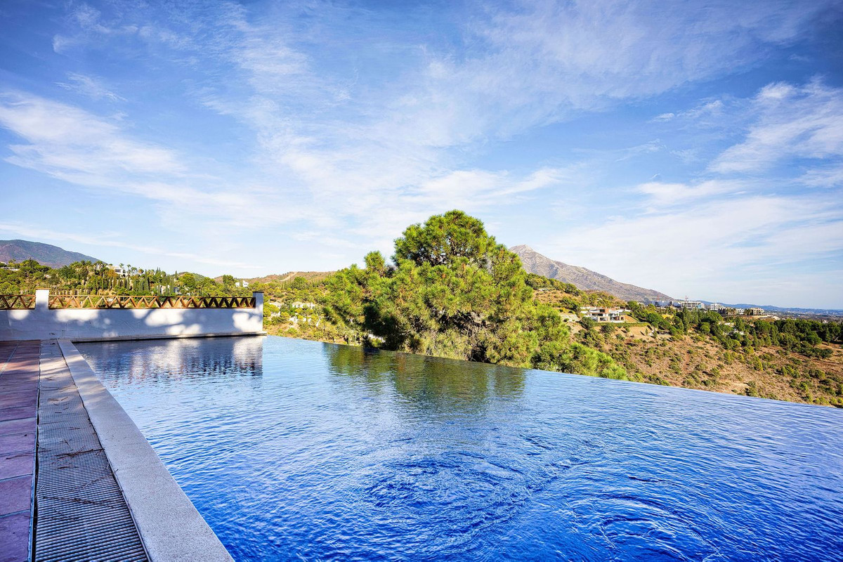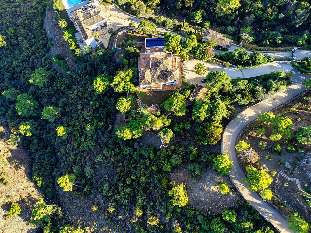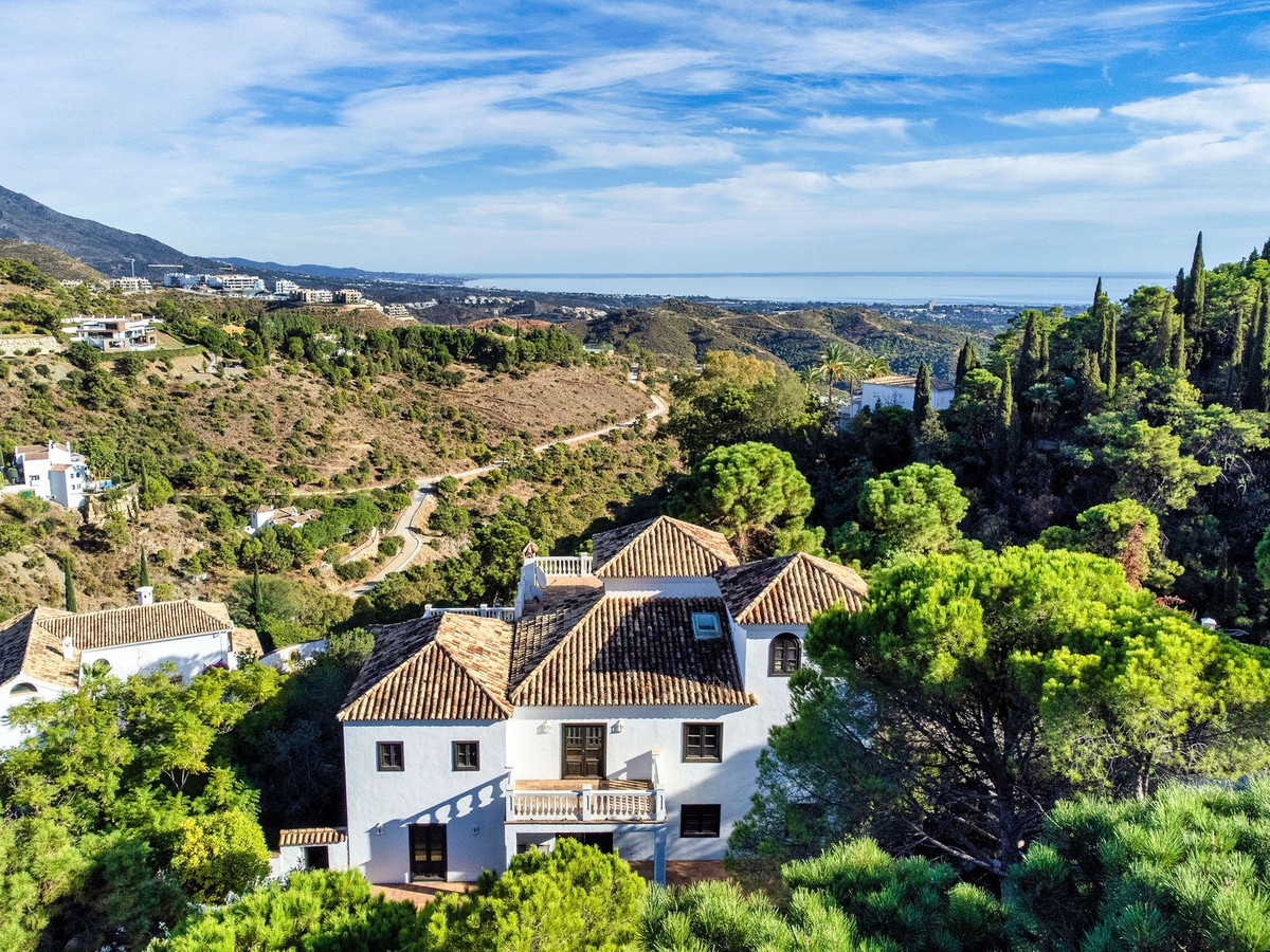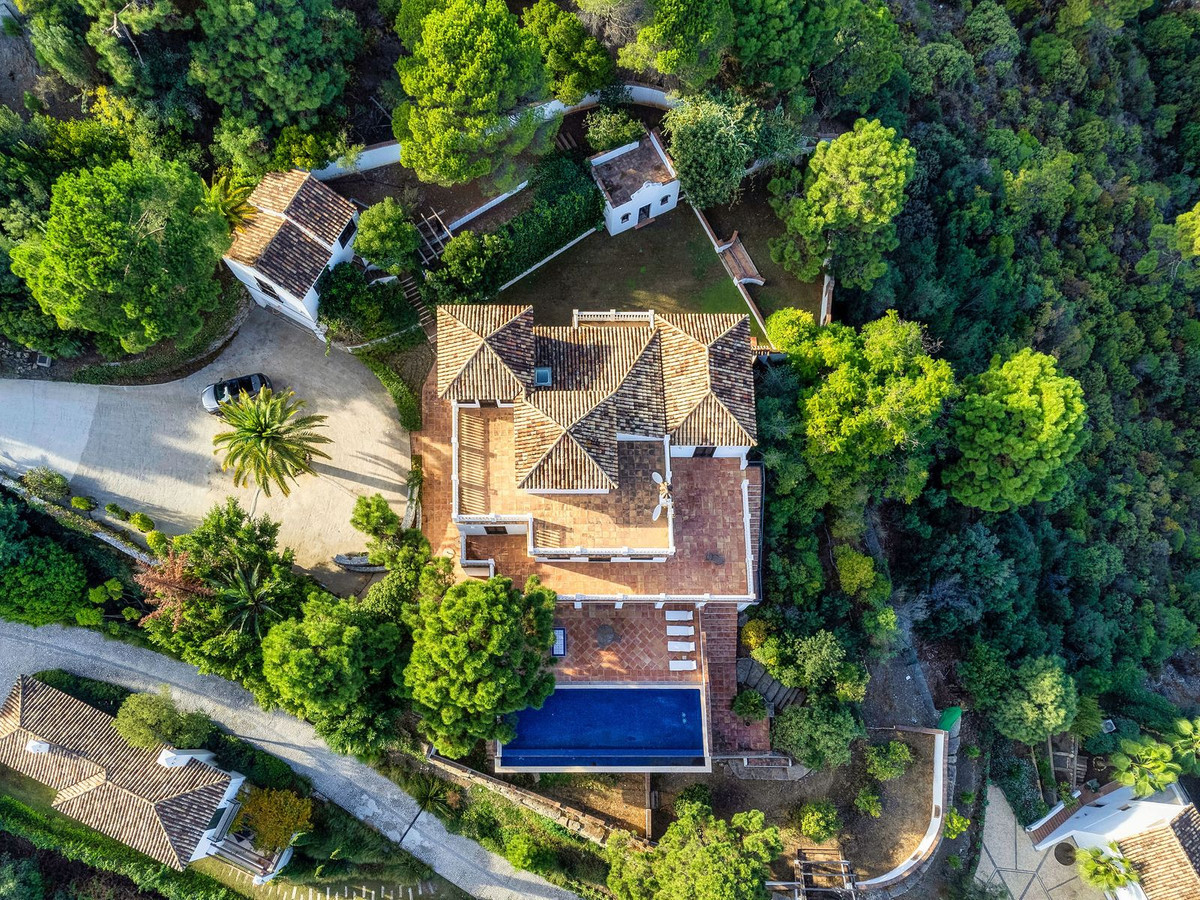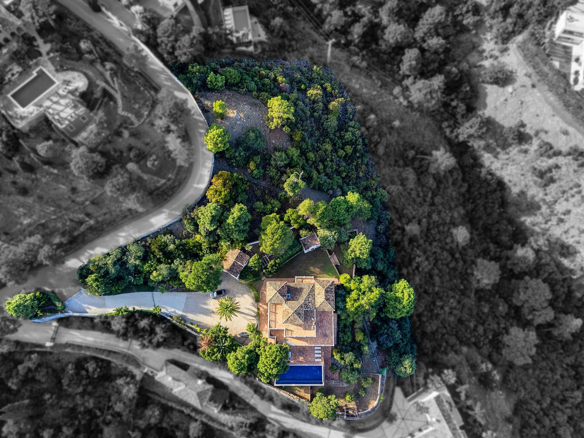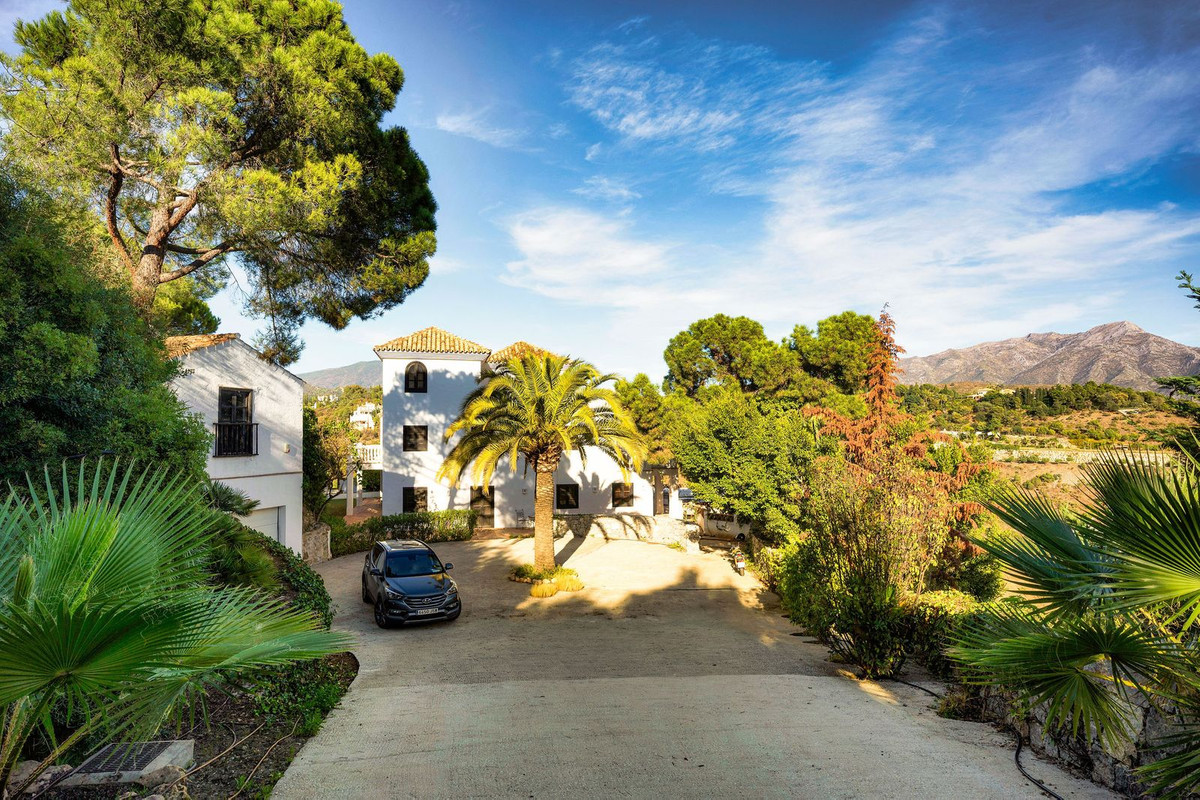 Classical style quality villa in urb. El Madroñal, entrance 2. Private and quiet, south-east to south facing. Views to La Concha mountain, the Coast of Marbella and the Mediterranean. The total land area of 5.900m2 gives this property/project different future devlopment possibilities.