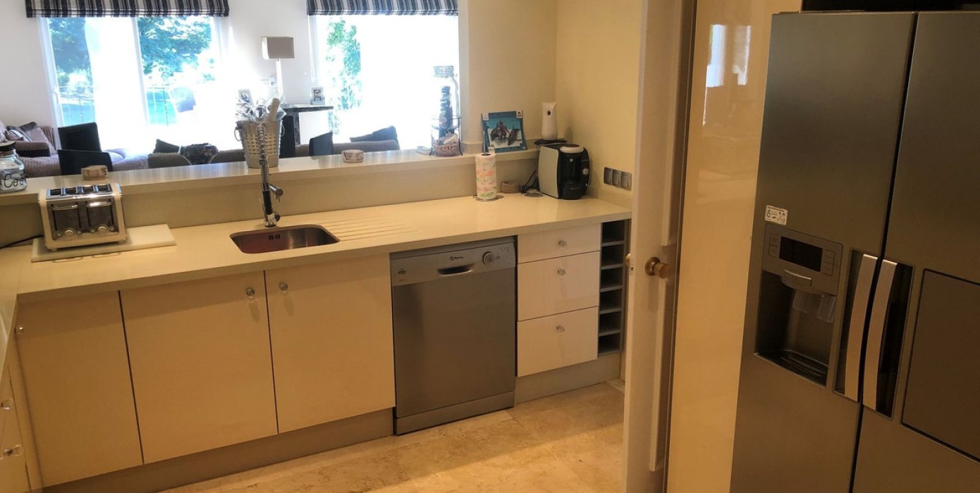 The villa has been reformed to a high standard, with a semi open plan kitchen, which has a breakfast bar and serving area directly adjacent to the living room and a separate dining room, which could easily be converted in to a 4th bedroom, if required. The 3 current bedrooms are all spacious doubles and all en-suite, with the master bedroom being particularly spacious and with direct access to the garden. There is a private gated parking space outside, and as the property is in a quite cul-de-sac, there is always ample parking available in the street