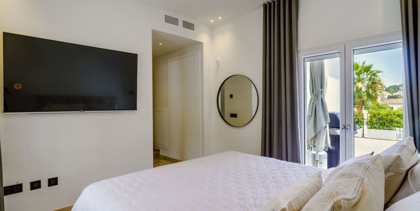 On the upper level is the master bedroom with its own walk in closet and spacious terrace with beautiful views over the golf valley, and towards the sea